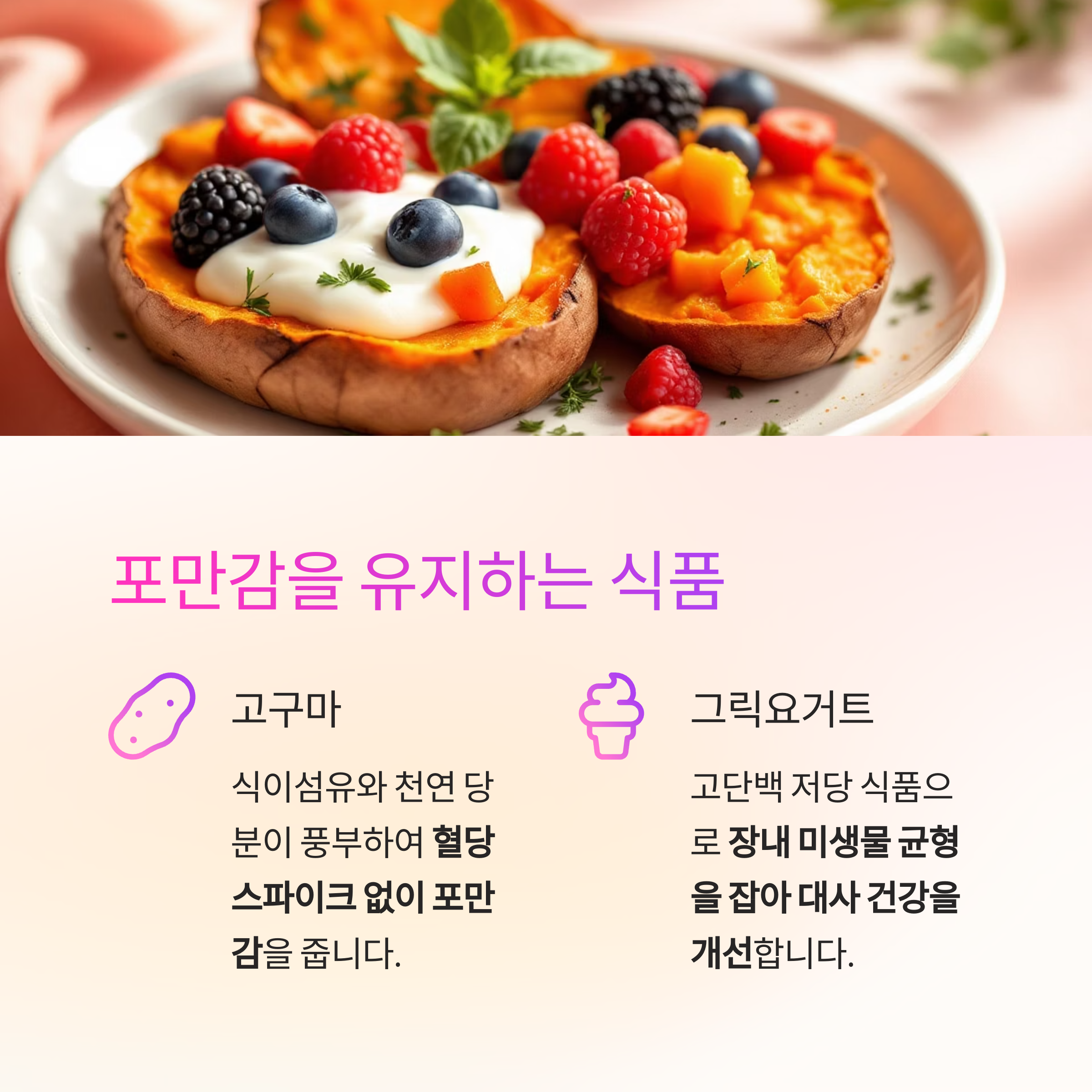 고구마는 식이섬유와 천연 당분이 풍부하여 혈당 스파이크 없이 포만감을 줍니다.