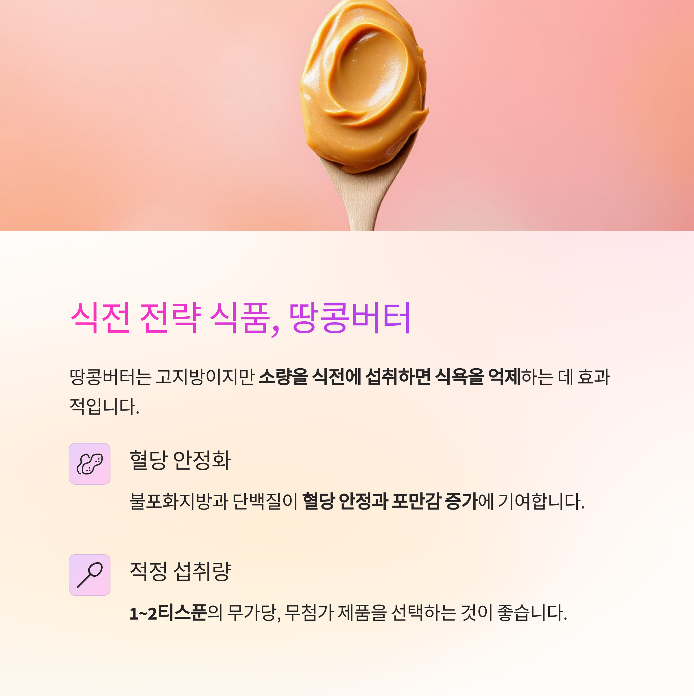 | 땅콩버터 | 단백질, 불포화지방산 | 식전 포만감, 식사량 조절 도움 |