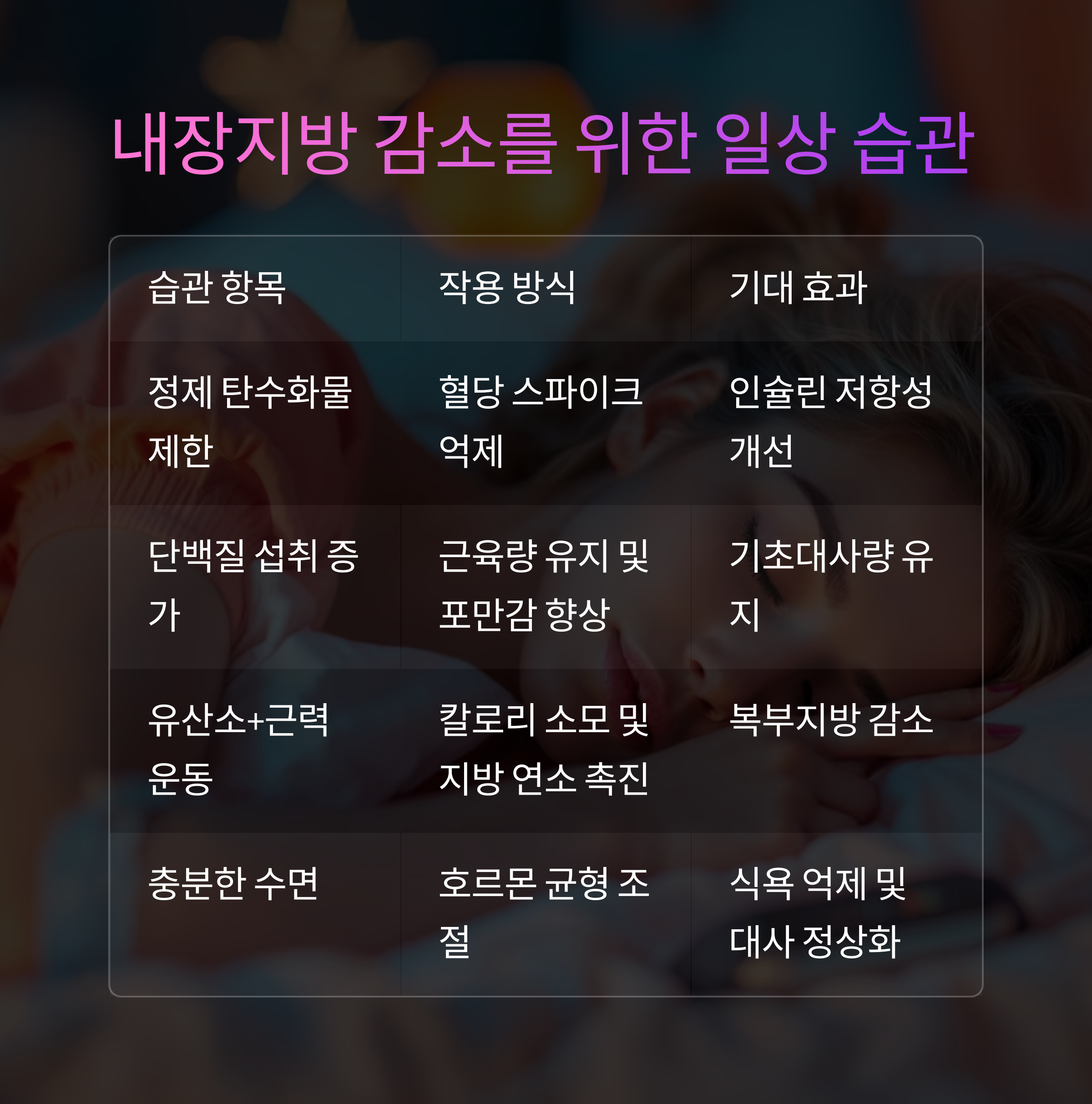 아래 표는 내장지방 감소에 효과적인 일상 습관과 그 이유를 정리한 것입니다.