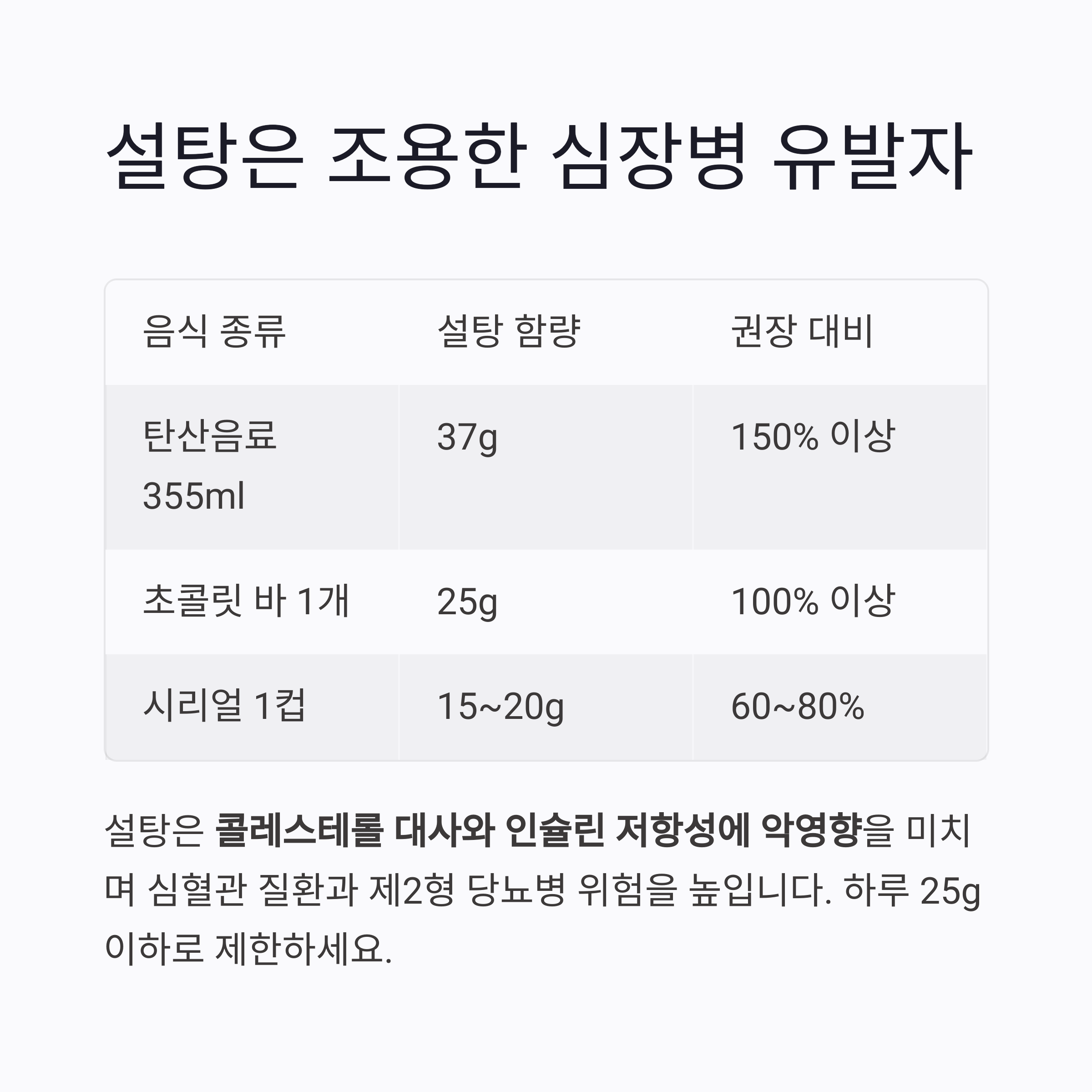 설탕 과다 탄산음료, 디저트, 시리얼 중성지방 상승, 당뇨 유발, 심장질환 위험 증가