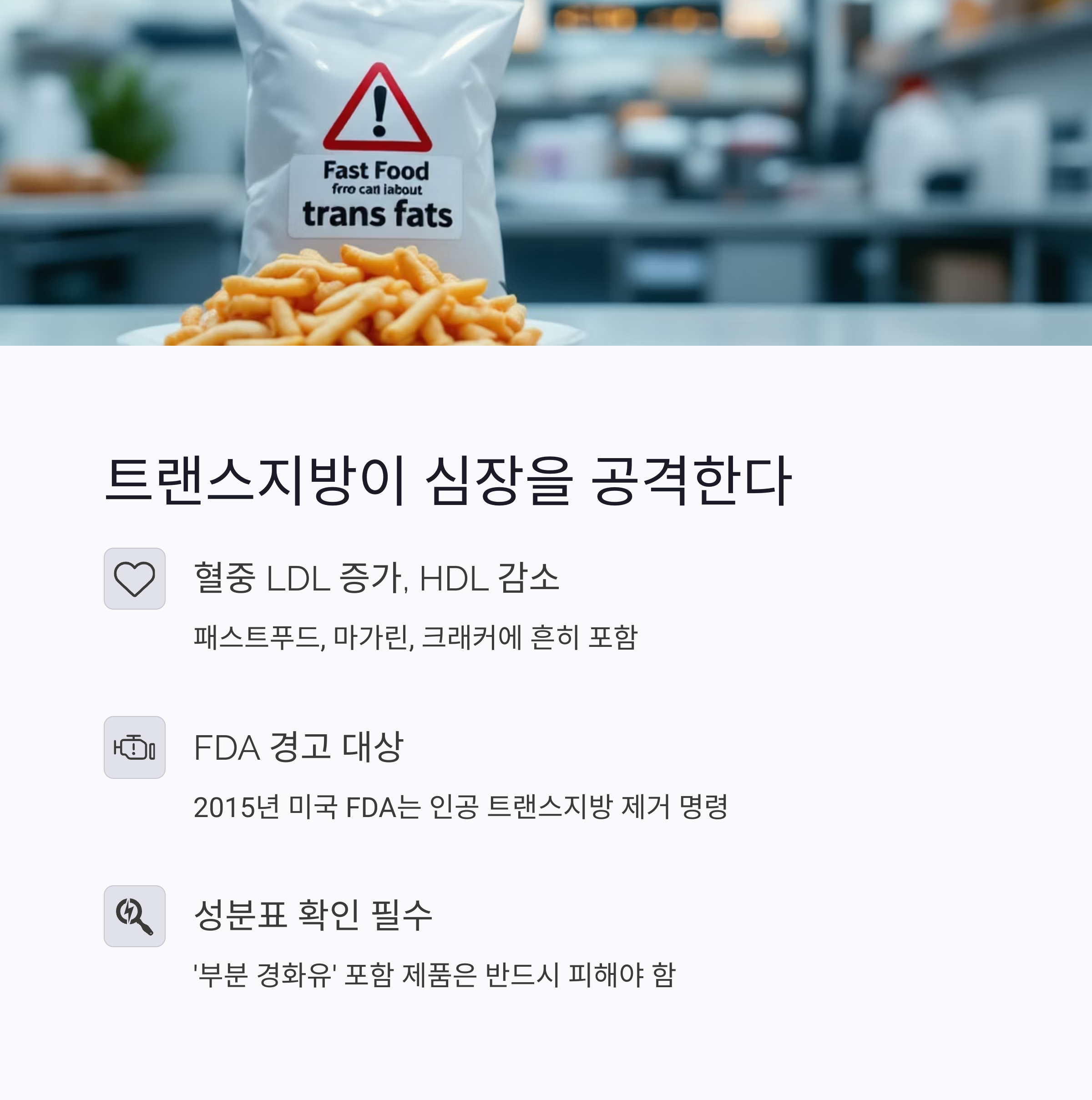 | 트랜스지방 | 마가린, 패스트푸드, 냉동식품 | LDL 증가, HDL 감소, 염증 유발 |