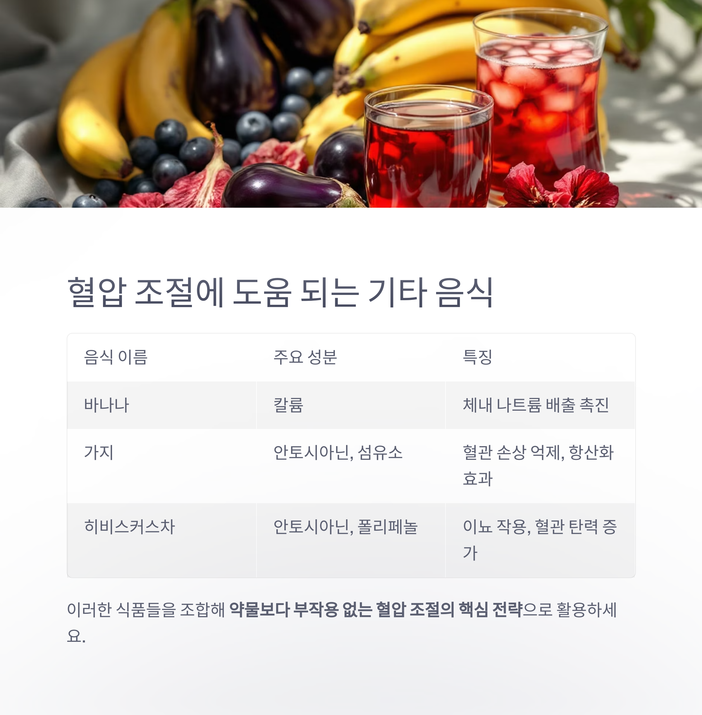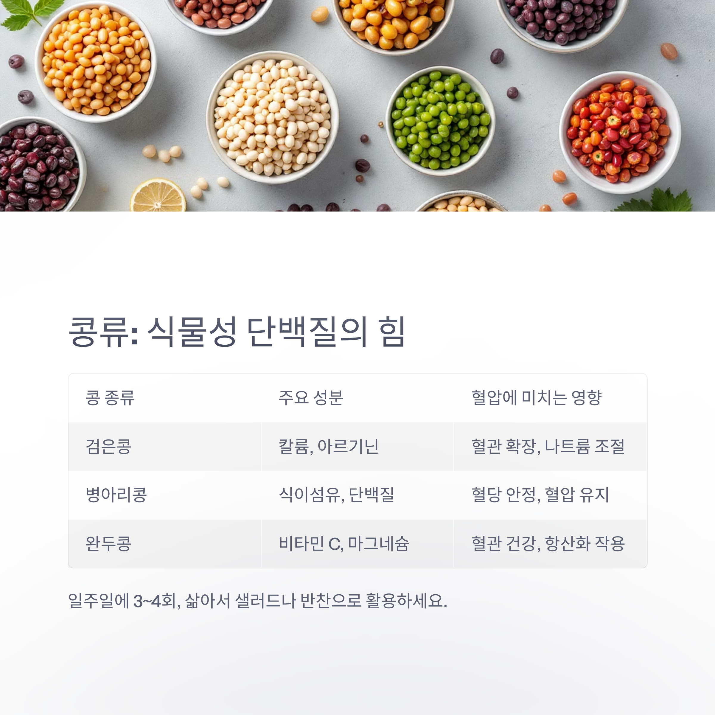 | 검은콩 | 칼륨, 아르기닌 | 혈관 확장, 나트륨 조절 |