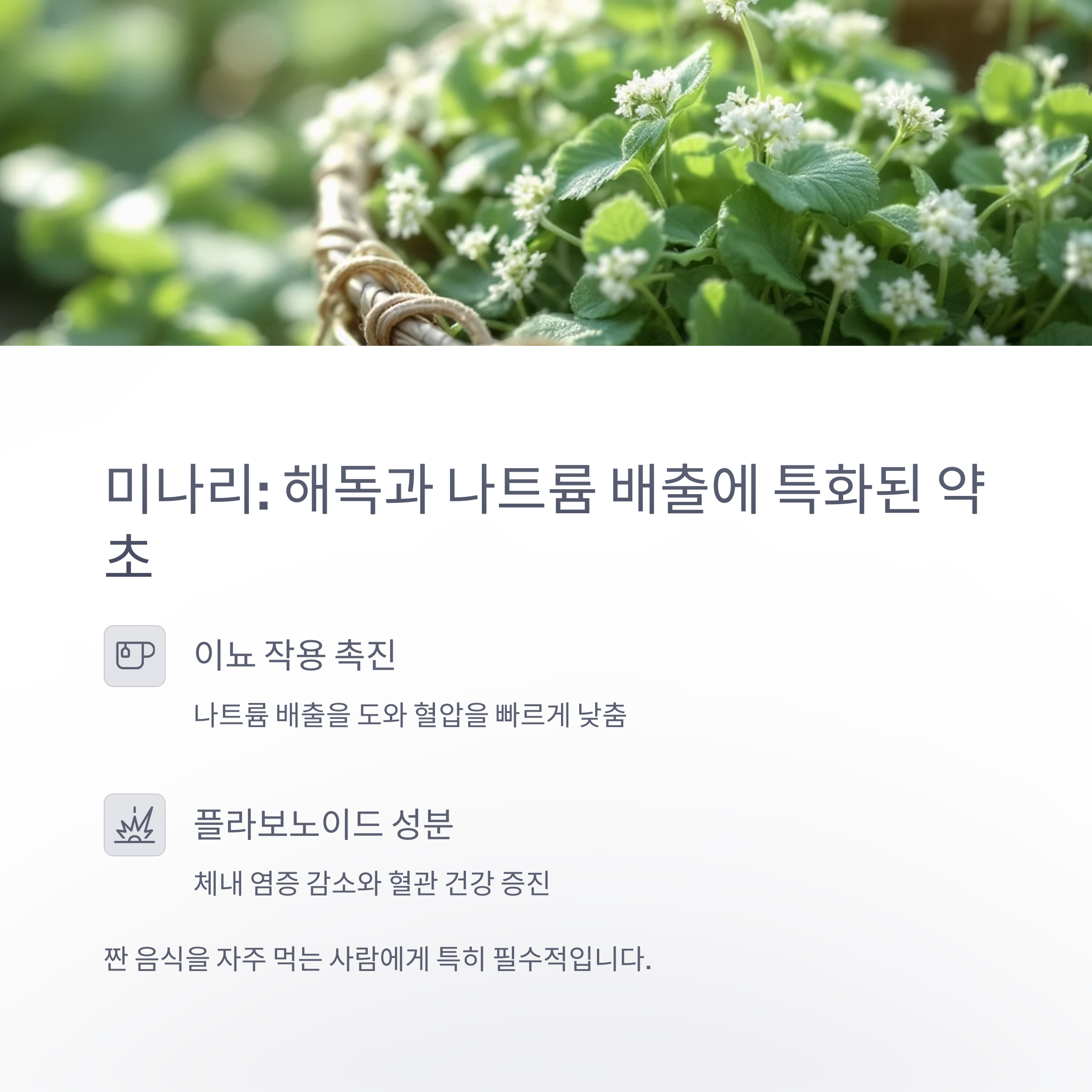 특히 짠 음식을 자주 먹는 사람이라면 미나리를 꾸준히 섭취하는 것이 필수적입니다.