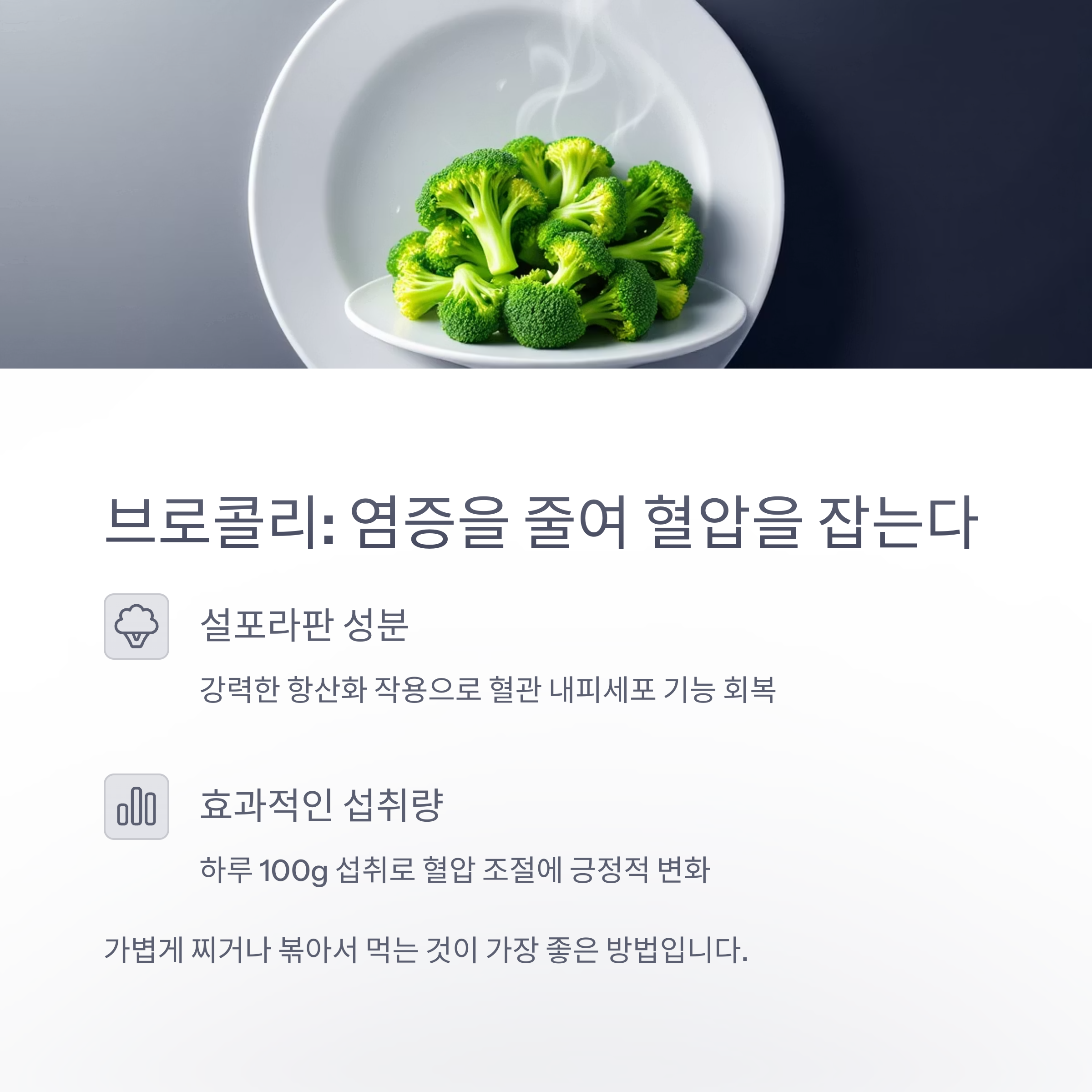 "하루 100g의 브로콜리 섭취만으로도 혈압 조절에 긍정적인 변화가 나타날 수 있다"는