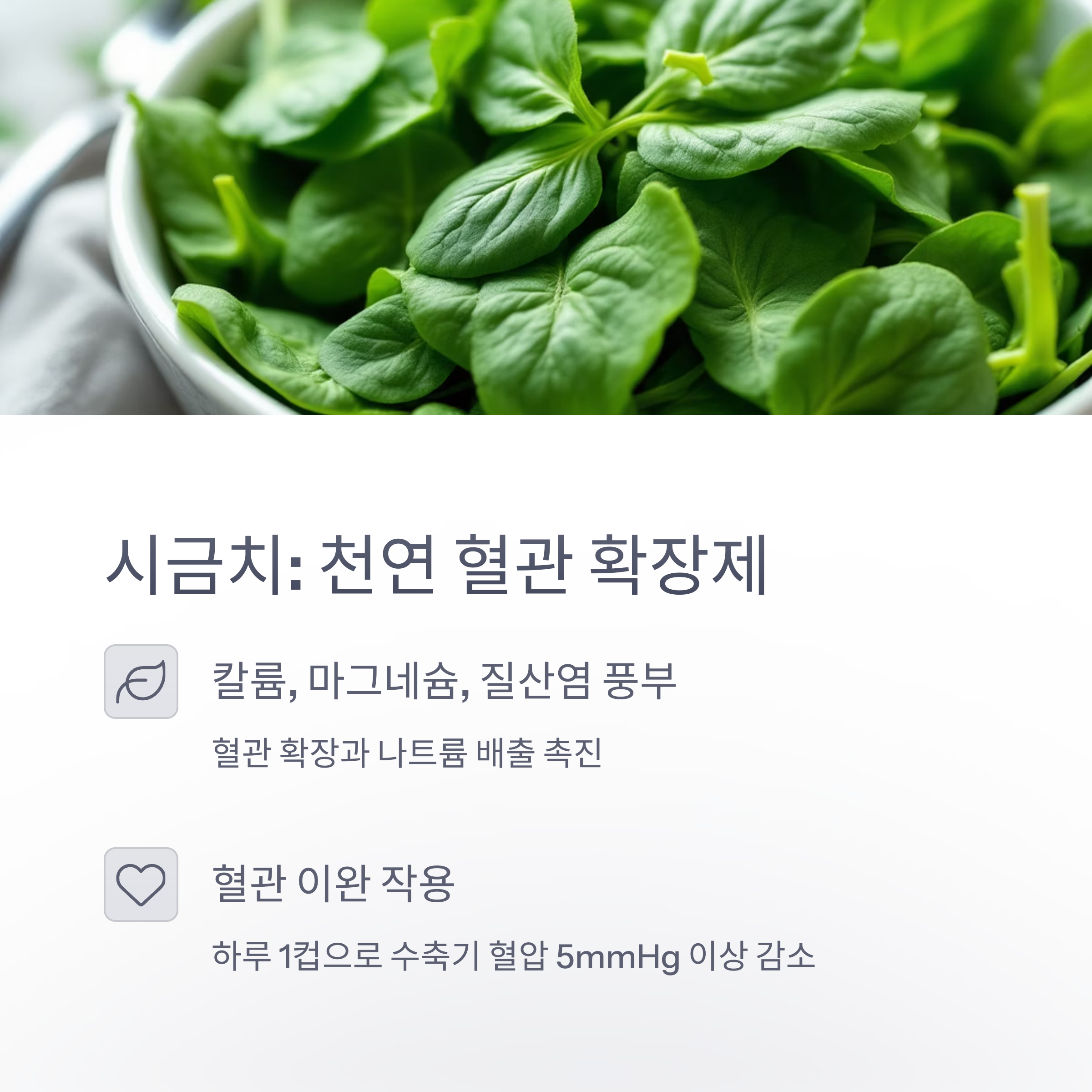 "하루 1컵 분량의 생 시금치만으로도 수축기 혈압을 5mmHg 이상 낮출 수 있다는 연구가 있습니다."