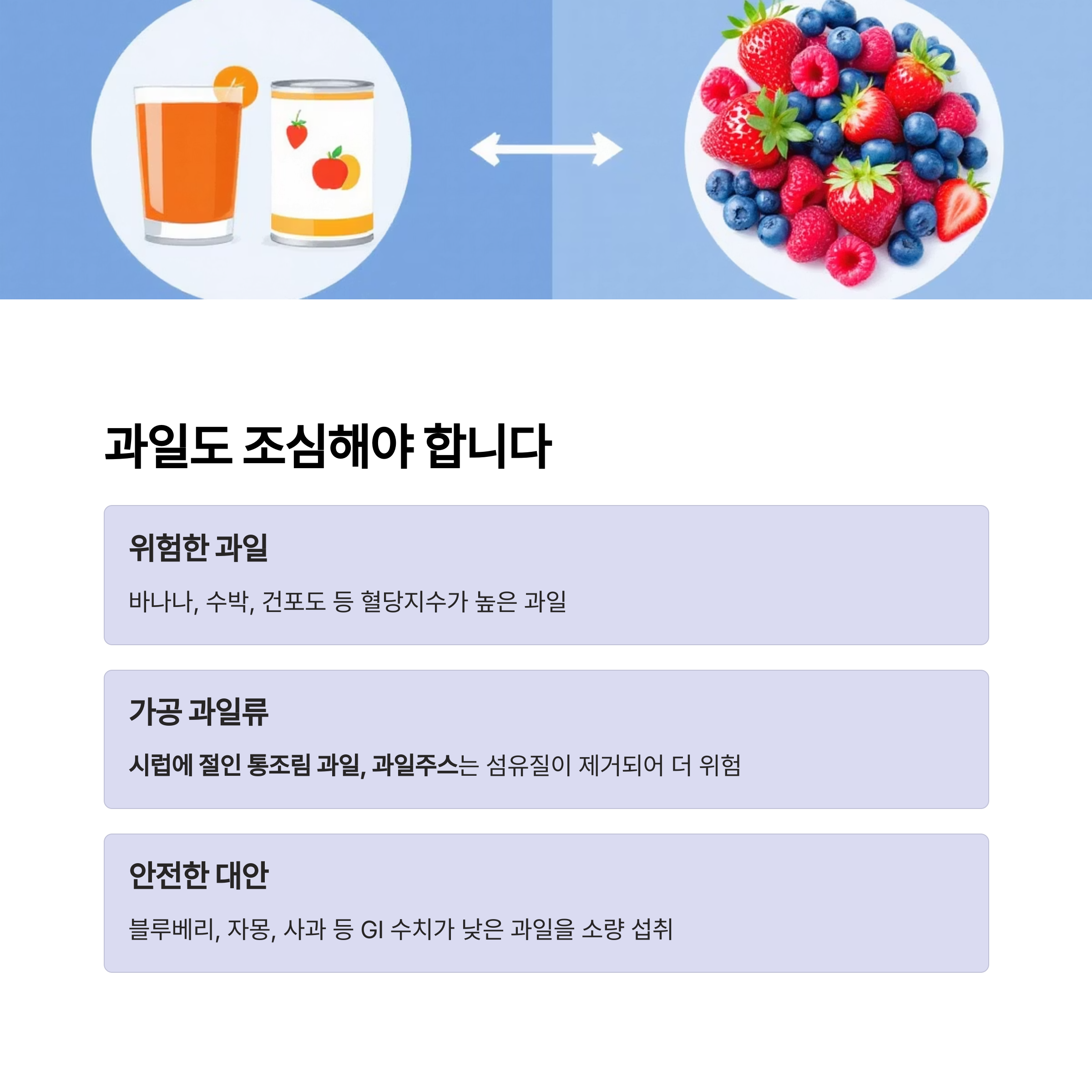 | 바나나, 수박, 주스 | 고혈당 과일, 액상당 | 빠른 흡수, 혈당 급상승 |