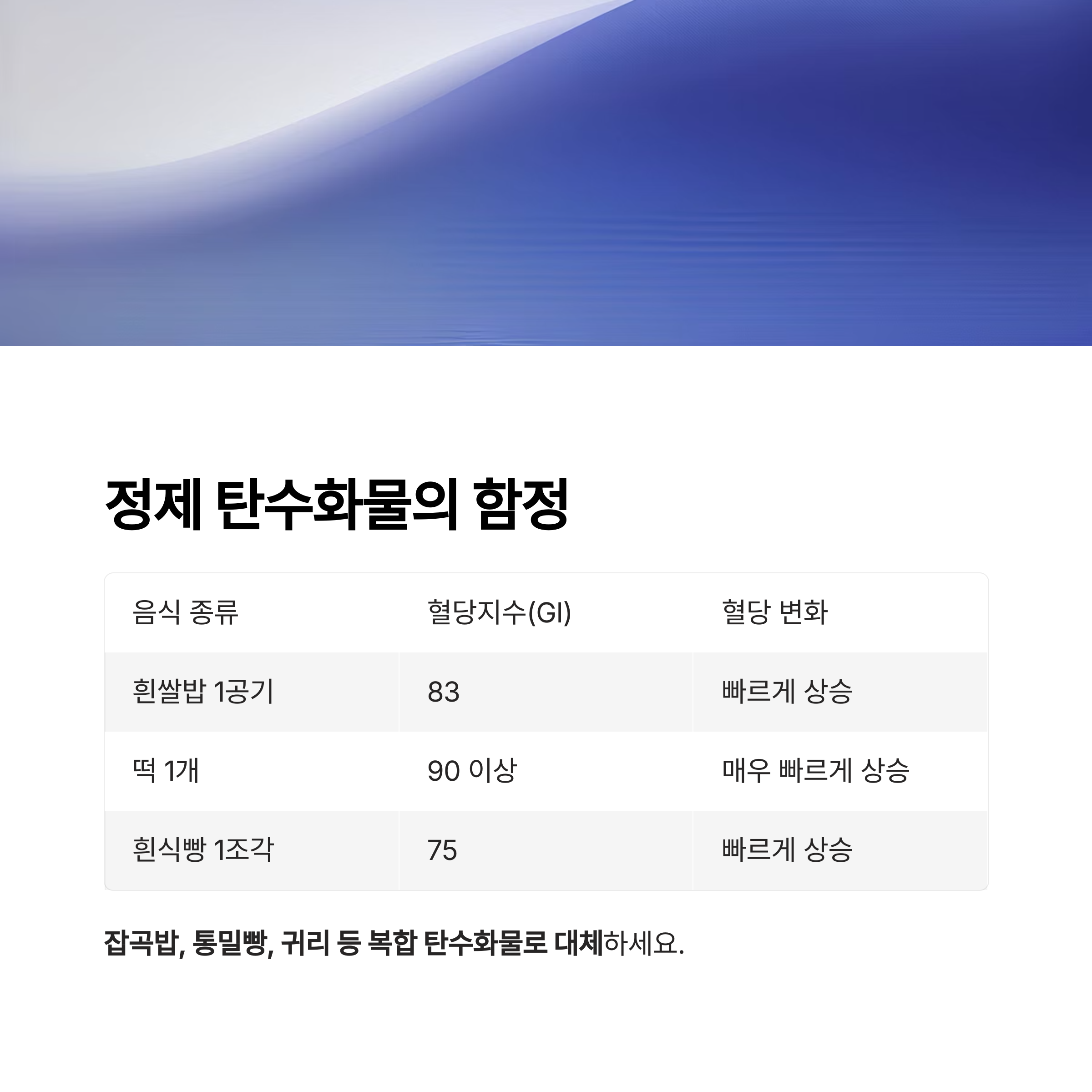 | 흰쌀, 떡, 밀가루 음식 | 정제 탄수화물 | 소화 빠름, 혈당 폭등 |