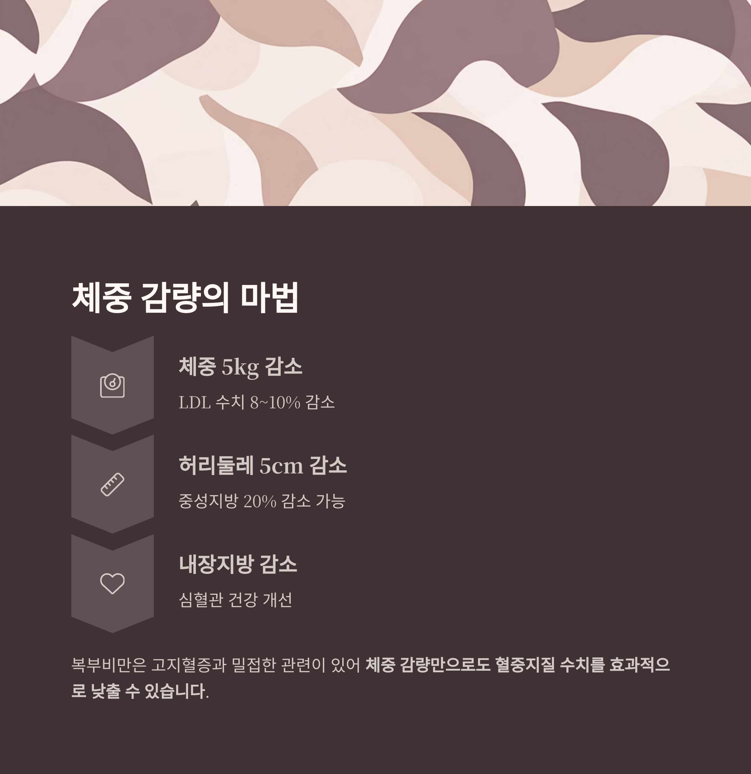 | 허리둘레 5cm 감소 | 중성지방 20% 감소 가능 |