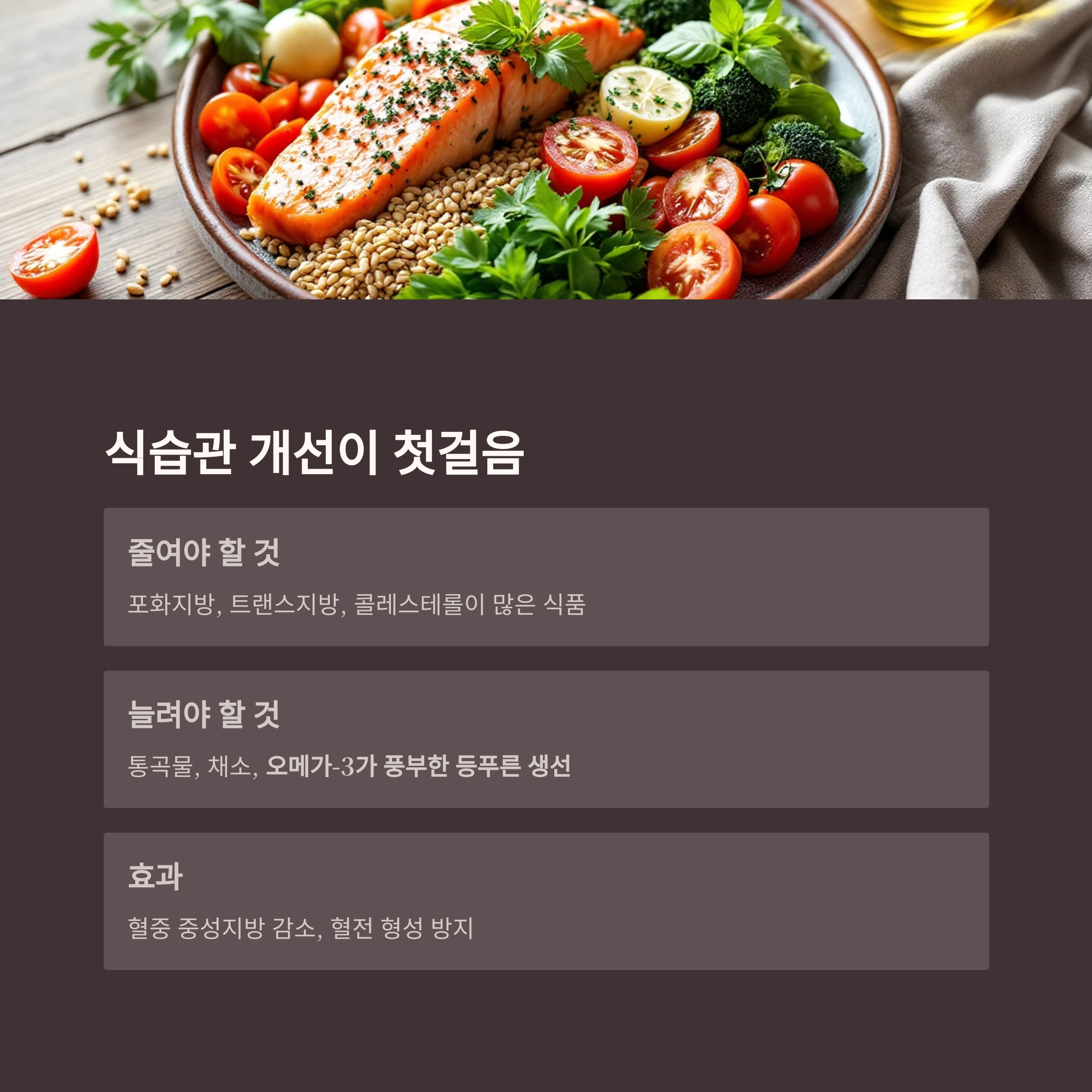 기름진 고기나 가공식품 속 포화지방과 트랜스지방을 줄이고, 대신 통곡물, 채소, 생선 위주의 식단으로 전환해야 합니다.