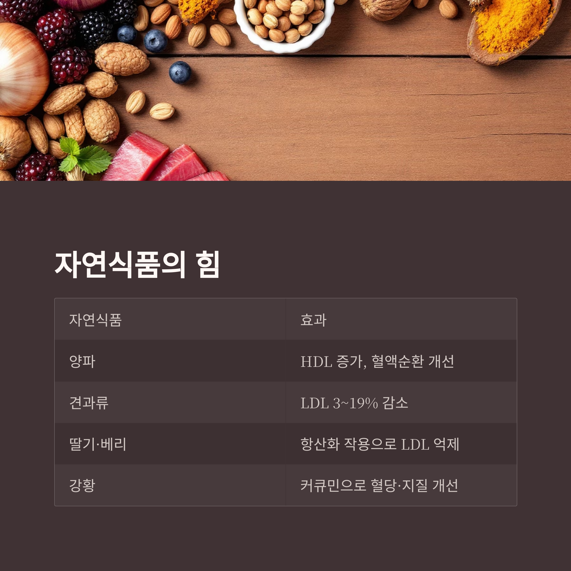 양파, 베리류, 견과류, 강황, 등푸른 생선 등은 그 자체로 콜레스테롤을 낮추고 혈관 건강을 도와주는 천연 약제입니다.