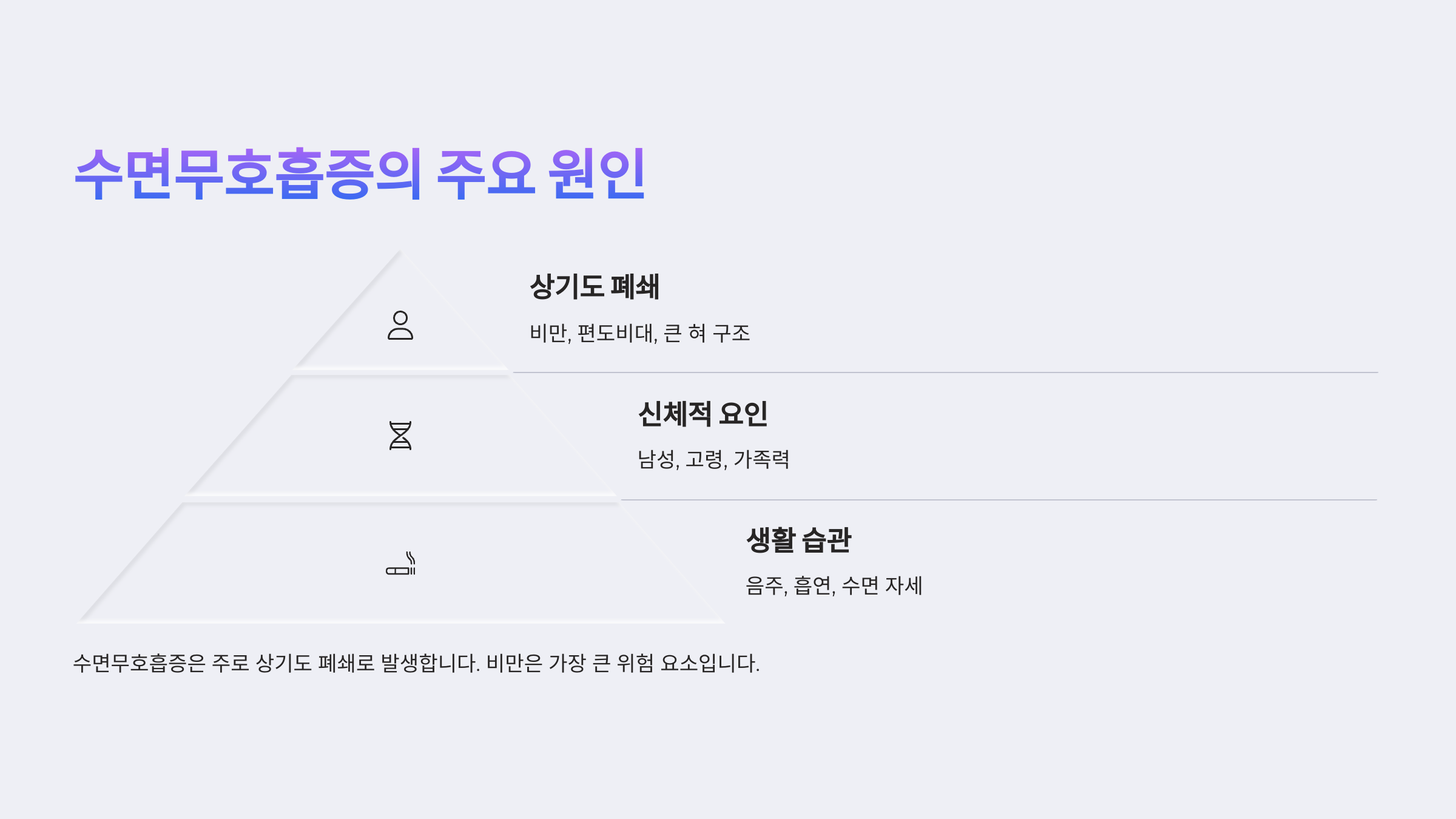 수면무호흡증은 여러 가지 원인으로 발생해요. 그중에서도 가장 흔한 유형은 폐쇄성 수면무호흡증(OSA)인데, 이는 기도가 물리적으로 막히는 것이 원인이죠. 특히 다음과 같은 요인이 위험도를 높입니다:
