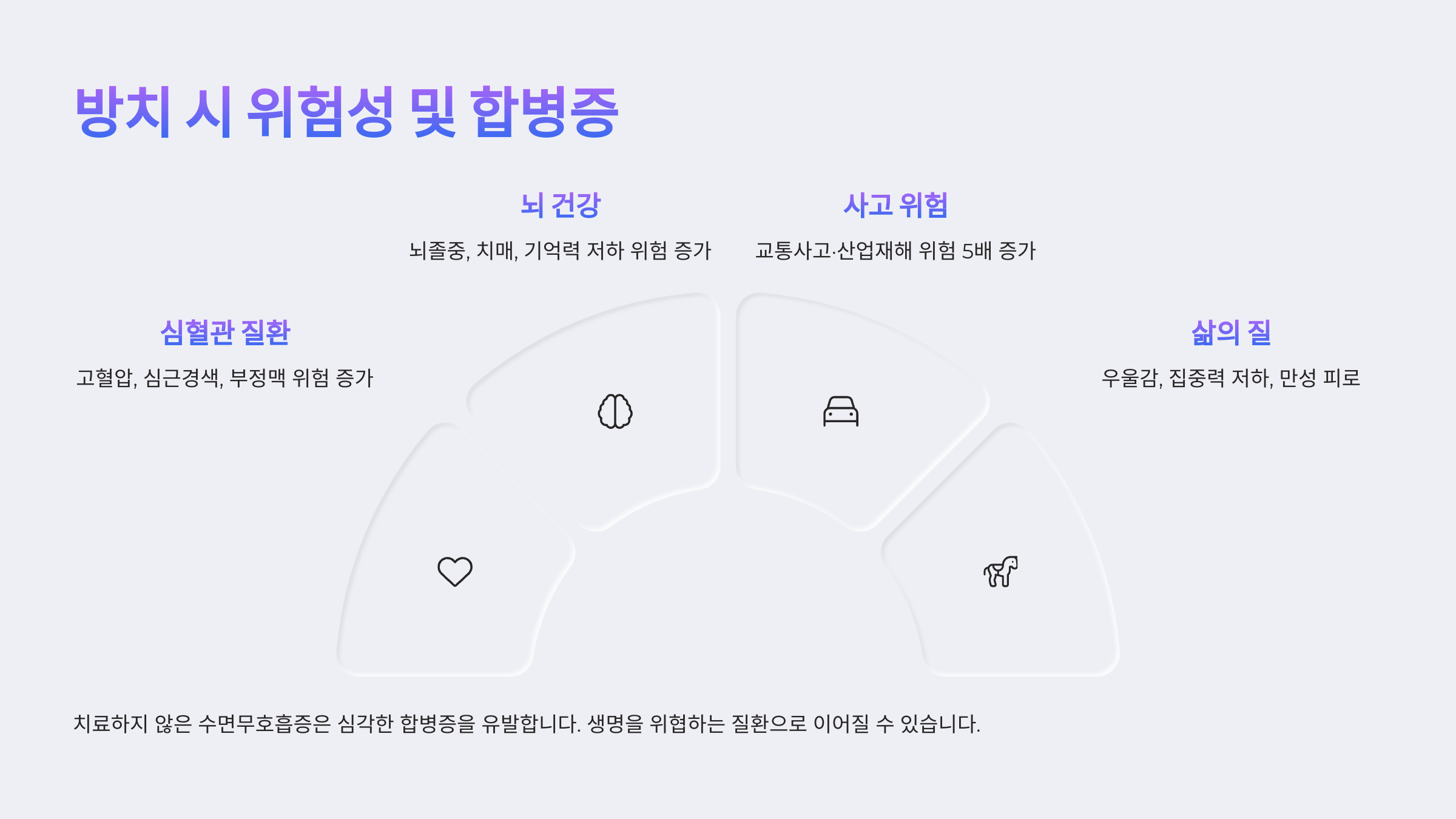 반복적인 저산소 상태는 심장과 뇌에 악영향을 주며, 치명적인 심혈관계 질환으로 이어질 수 있어요.