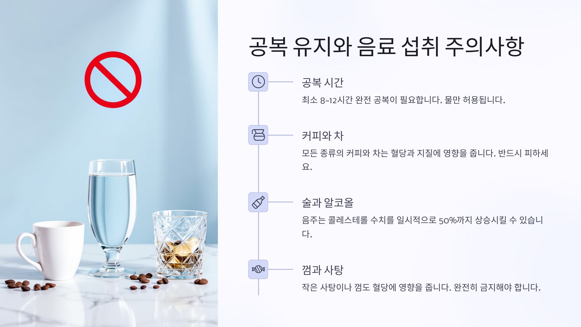 식사 후 수 시간 내 측정된 수치는 실제 건강 상태를 왜곡할 수 있어요. 검사 전날 저녁부터 금식을 지키는 것이 정확한 결과를 위한 핵심입니다.