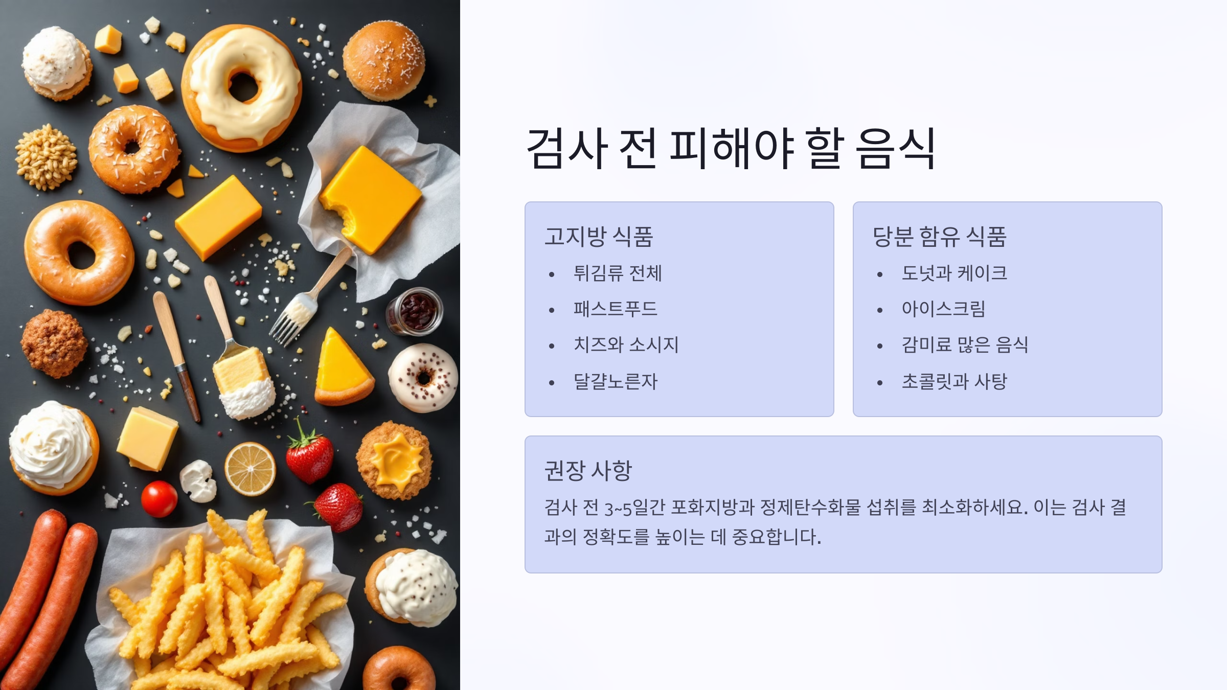 전날 밤의 한 끼가 다음날 검사 결과를 좌우한다는 걸 꼭 기억해 주세요. 검사 전날 식단은 단순한 준비가 아니라 건강한 신호를 보내는 과정이에요.