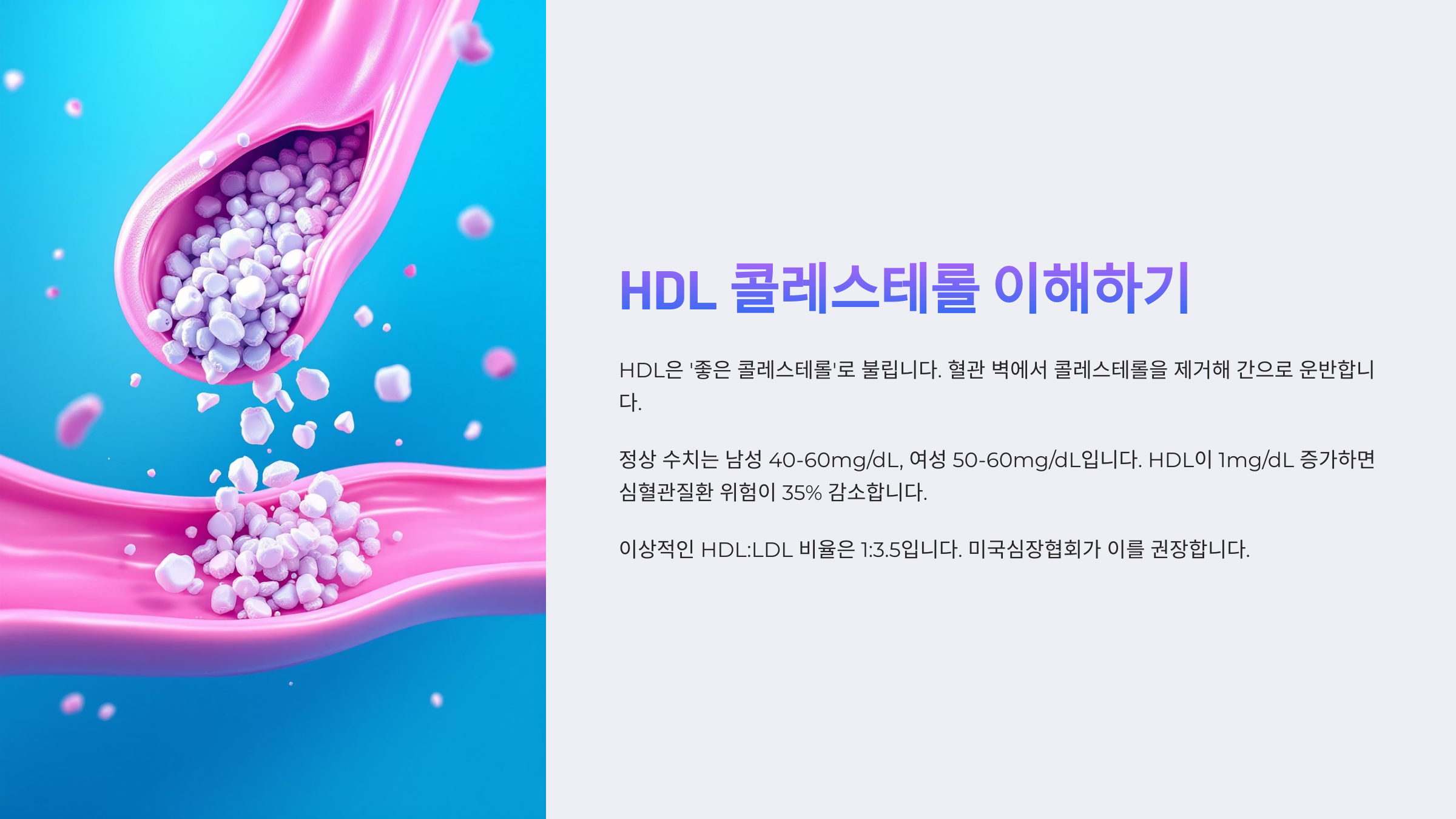 HDL은 혈관 내 노폐물을 제거하고 LDL 콜레스테롤을 간으로 보내는 역할을 해요. 높을수록 심혈관 질환 예방에 효과적입니다.