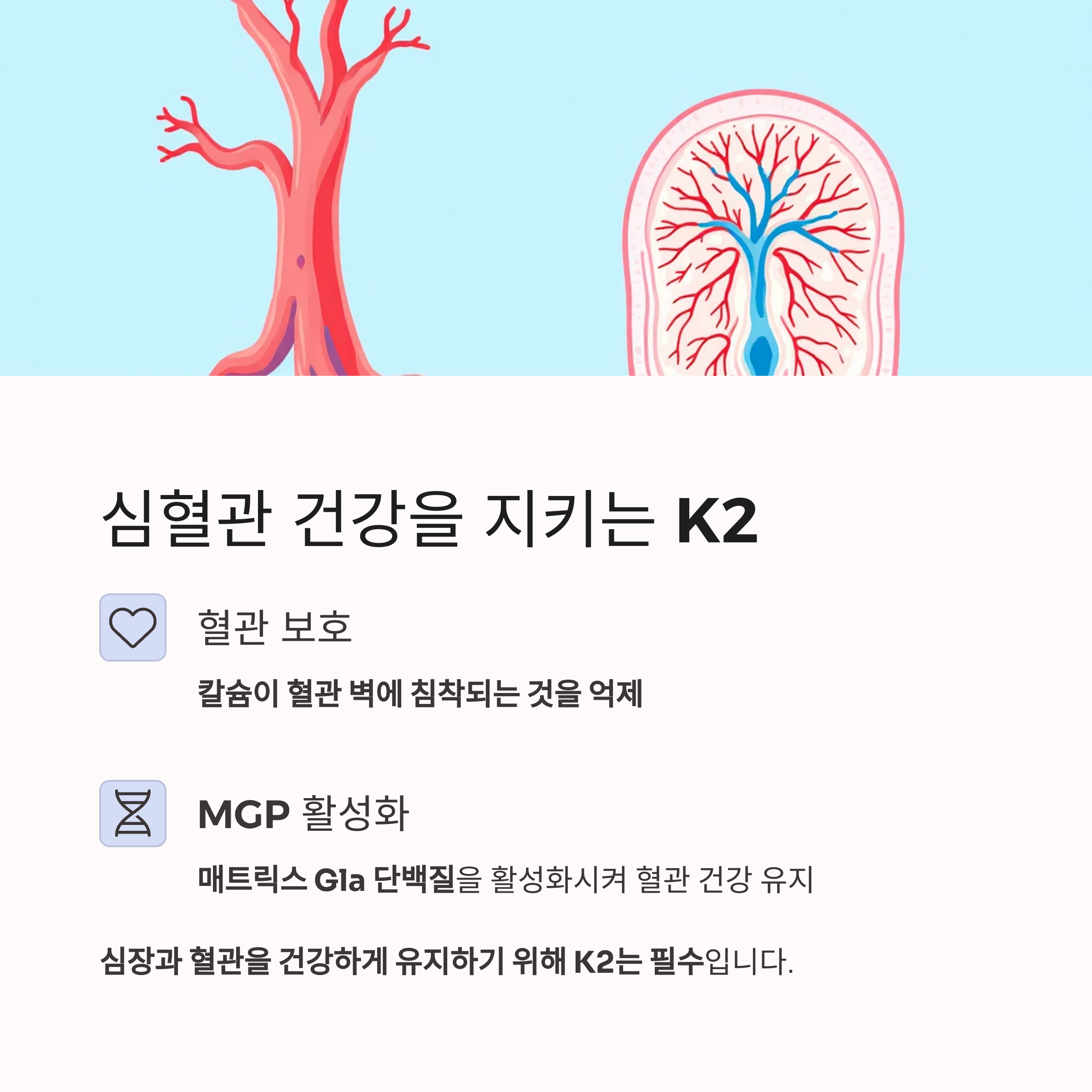 즉, 심장과 혈관을 건강하게 유지하기 위해 K2는 필수입니다.