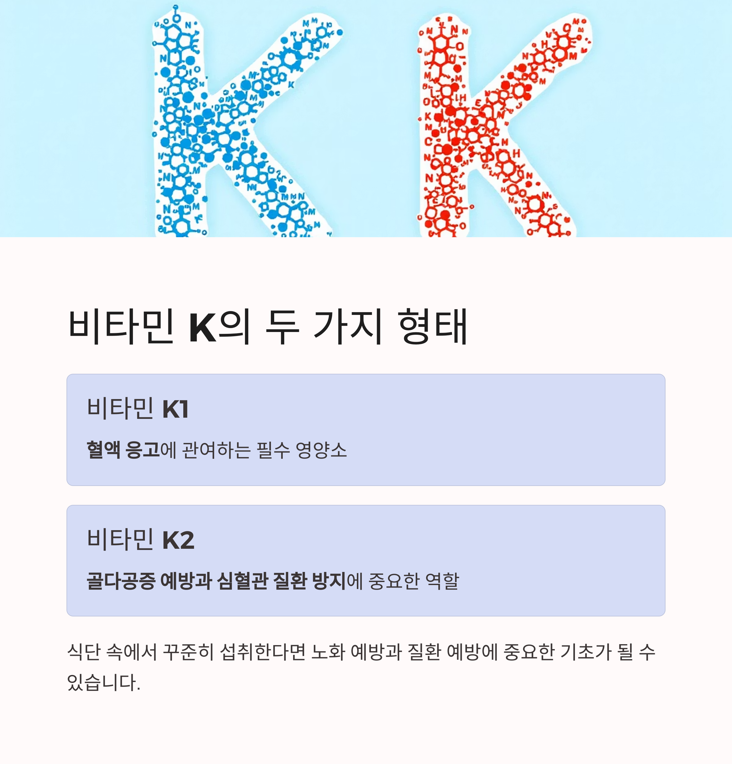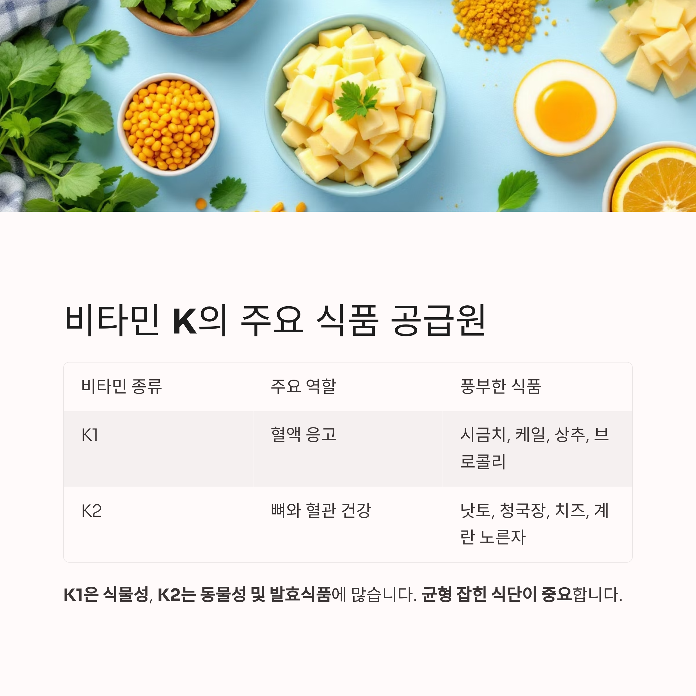 비타민 K는 K1과 K2 두 가지로 나뉘며, 각각 혈액 응고와 뼈·혈관 건강에 관여합니다.