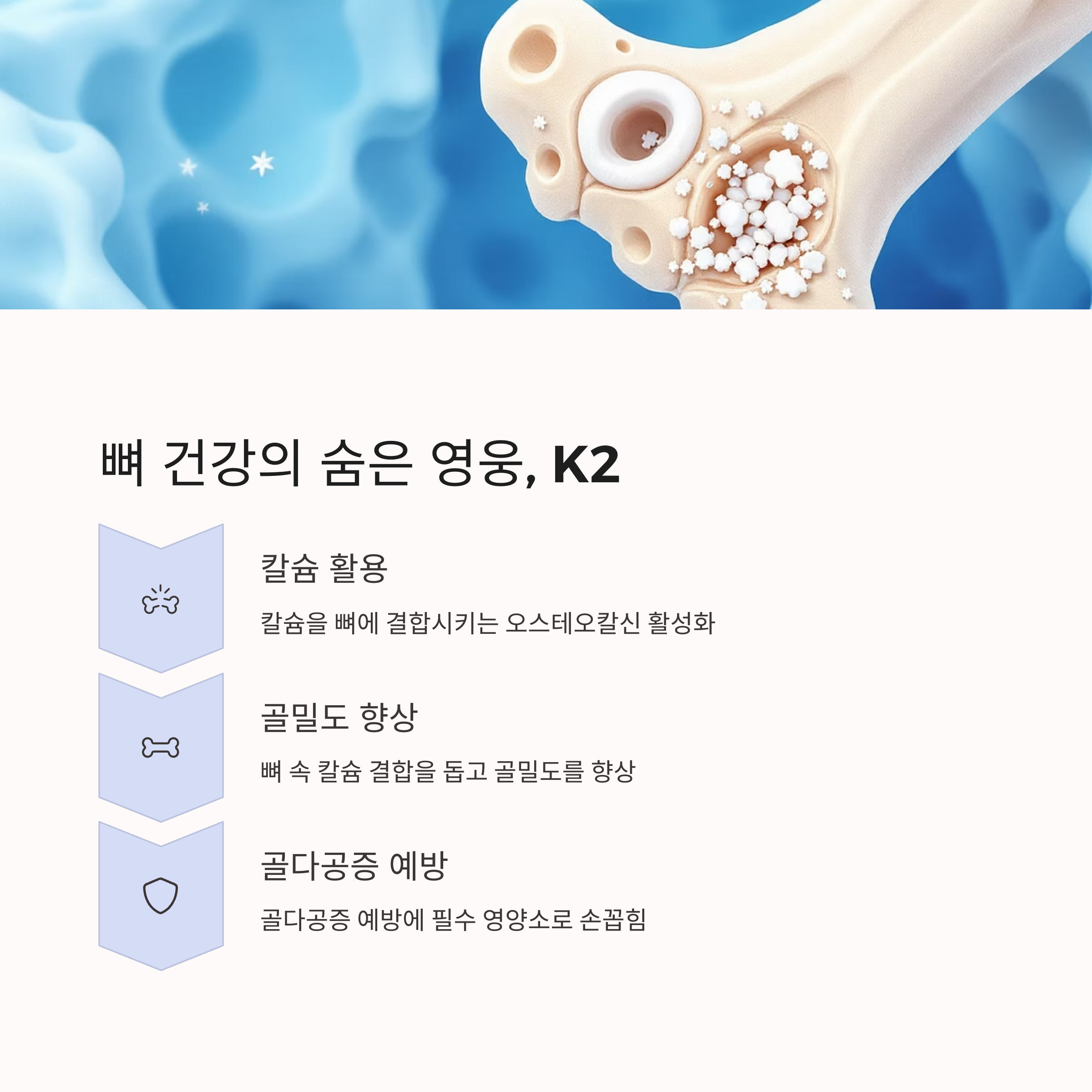 K2는 오스테오칼신을 활성화하여 뼈 속 칼슘 결합을 돕고, 골밀도를 향상시킵니다.
