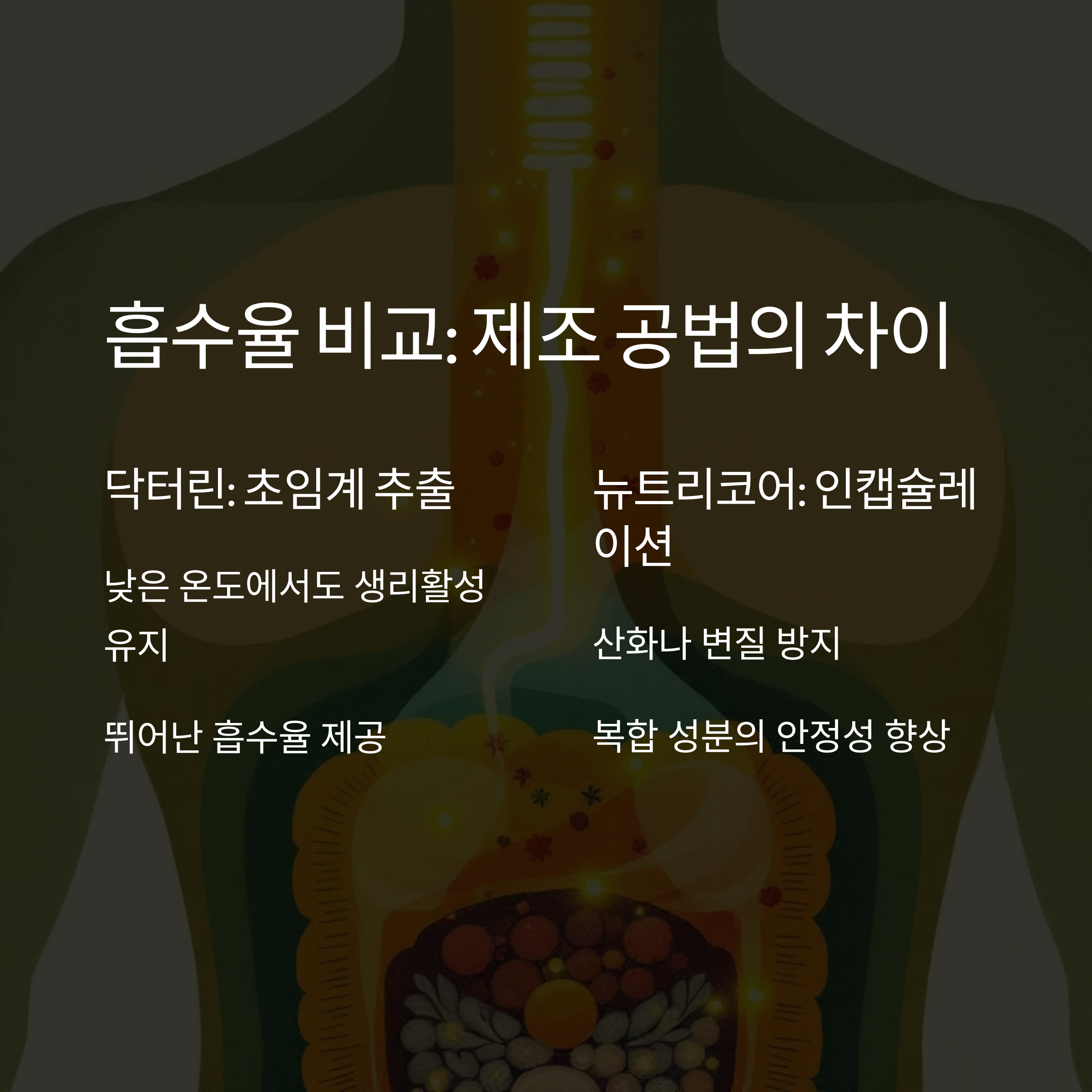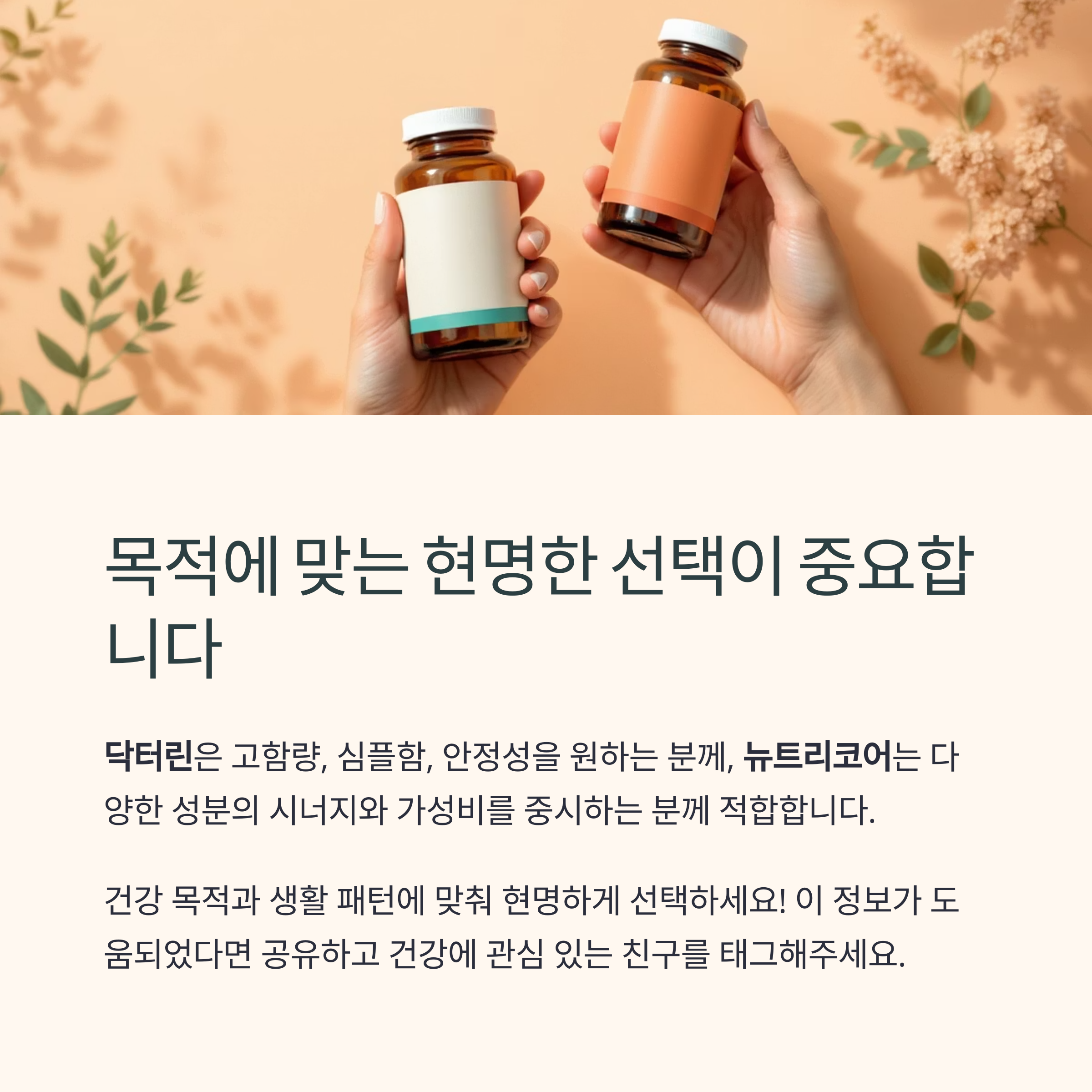→ 닥터린은 소형 정제라 목 넘김이 좋고, 뉴트리코어는 캡슐형으로 위에 부담이 적습니다
