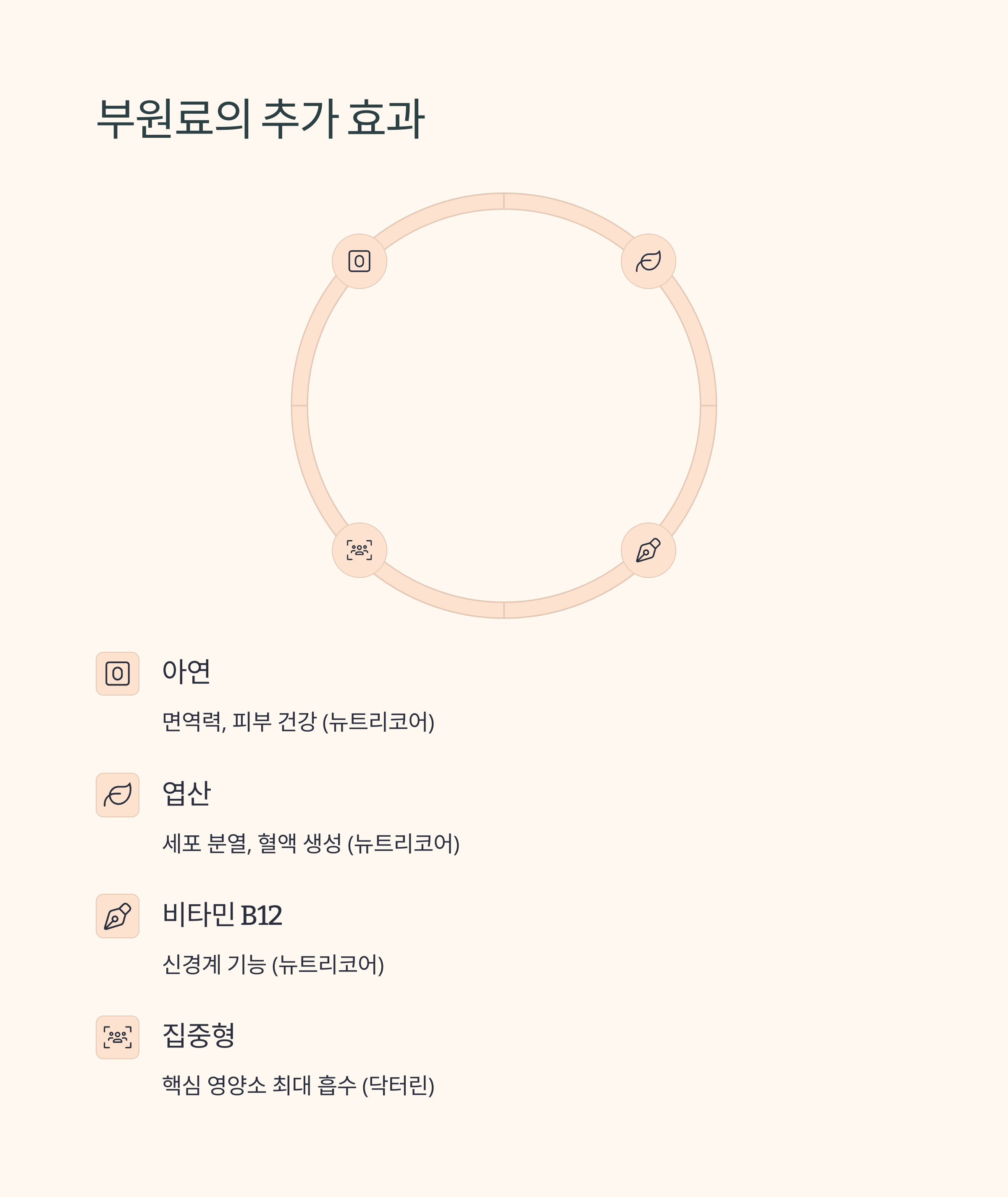| 부원료 | 없음 | 아연, 엽산, B12, 케르세틴 등 |