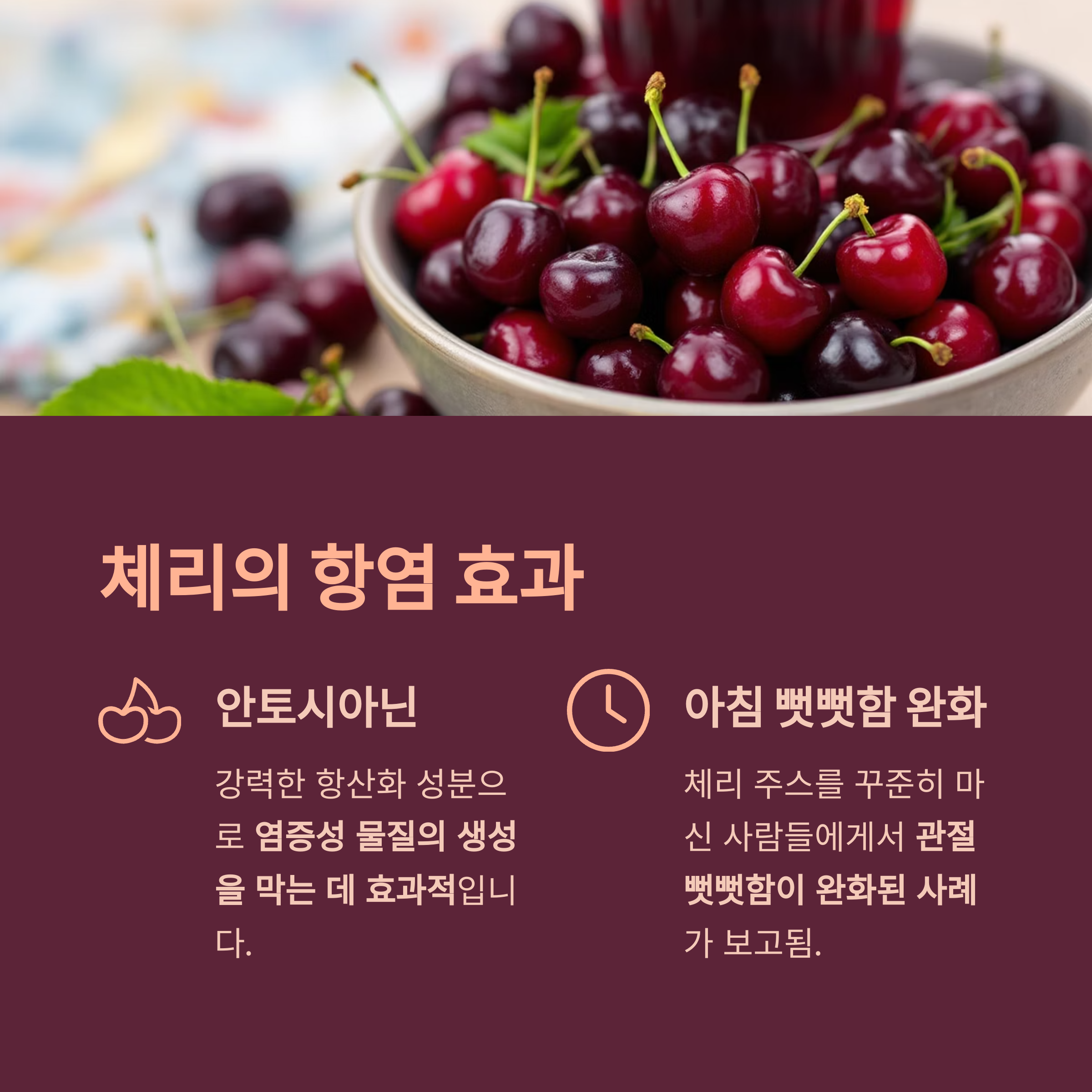 체리는 강력한 항산화 성분인 안토시아닌이 풍부하여, 염증성 물질의 생성을 막는 데 효과적입니다.