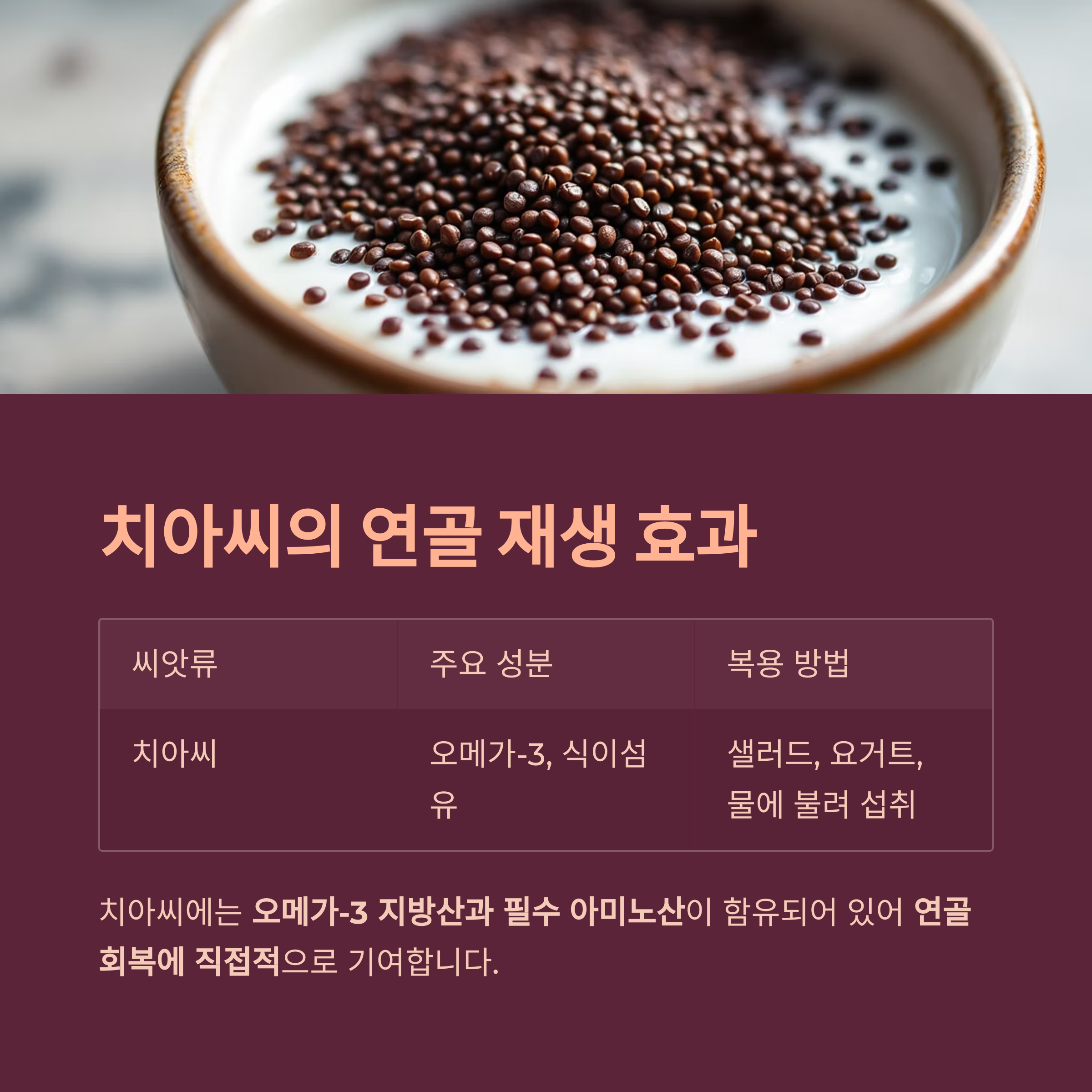 치아씨에는 오메가-3 지방산과 필수 아미노산이 함유되어 있어 연골 회복에 직접적으로 기여합니다.