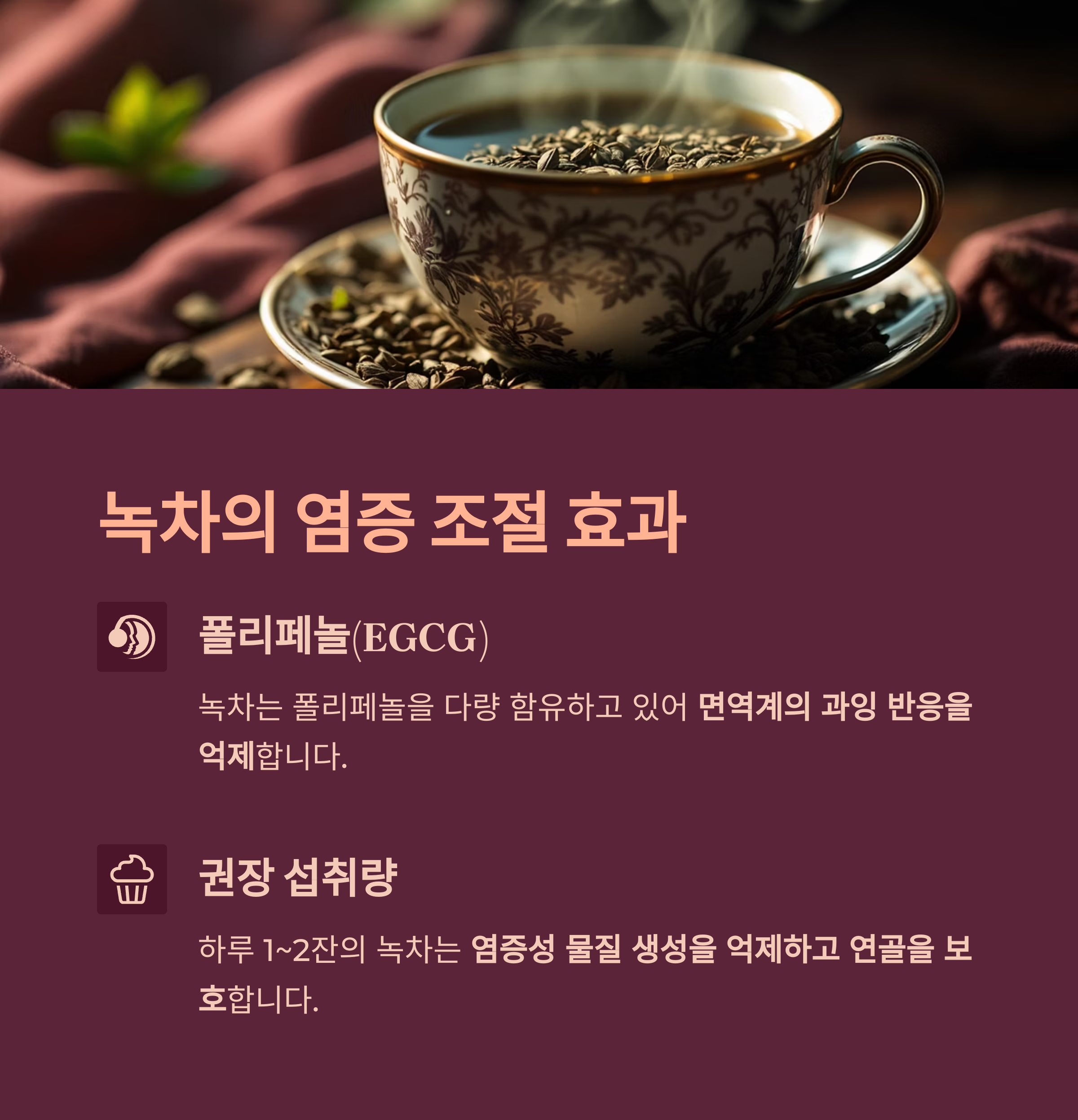 하루 1~2잔의 녹차는 염증성 물질 생성을 억제하고 연골을 보호하는 데 효과적입니다.