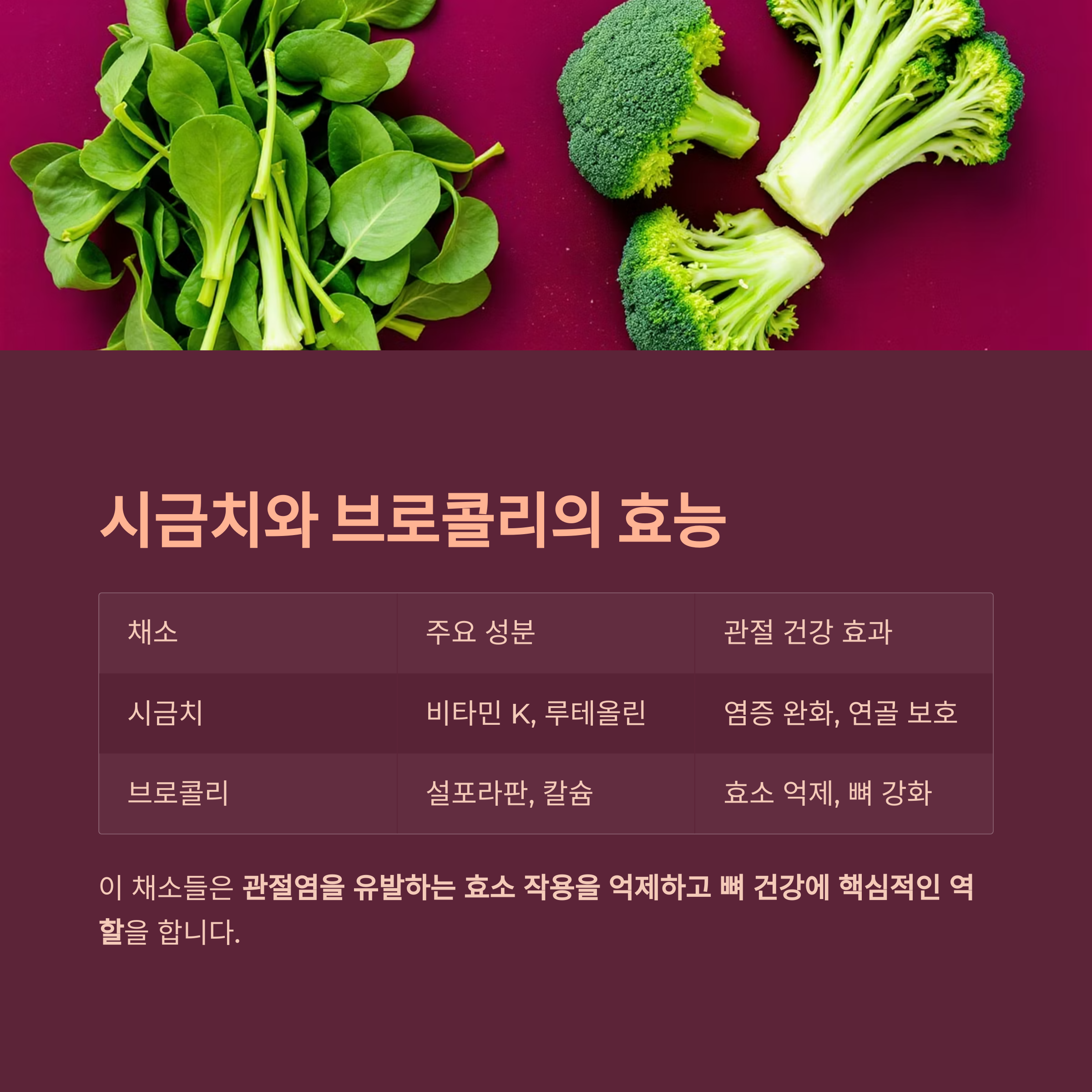 | 시금치 | 비타민 K, 루테올린 | 염증 완화, 연골 보호 |