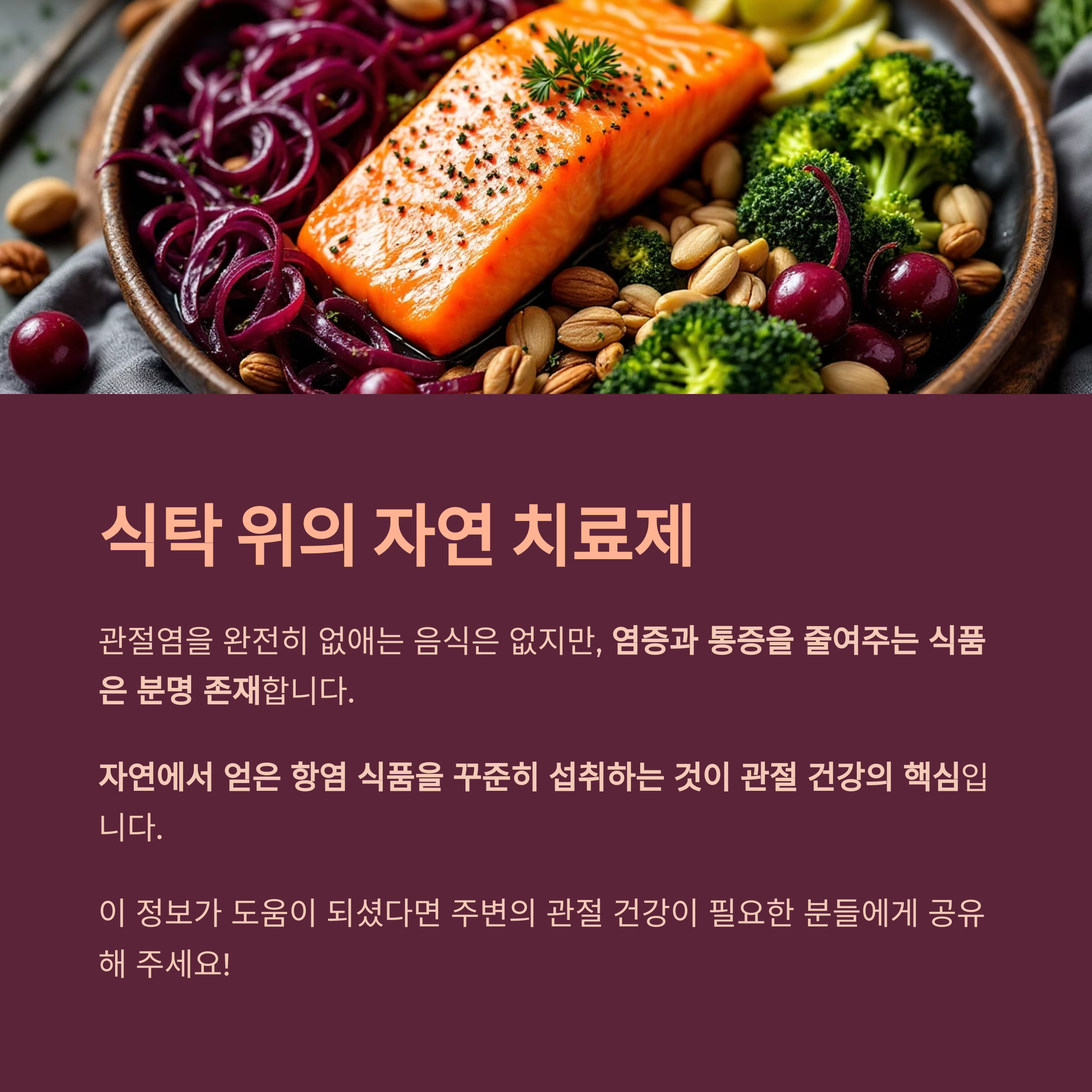 자연에서 얻은 항염 식품을 꾸준히 섭취하는 것이 관절 건강의 핵심입니다.